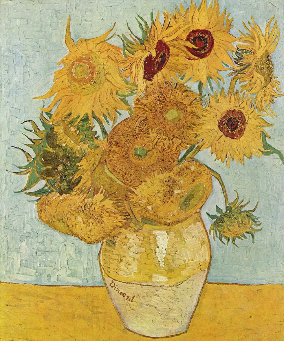 La série de natures mortes « les tournesols » est sans doute la plus connue de Van Gogh. Ente août 1888 et janvier 1889, l’artiste va peindre 7 tableaux dans lesquels ces fleurs héliotropes sont représentées lors de différentes phases de leur vie depuis leur éclosion jusqu’à leur flétrissement. Deux tableaux similaires, dont l’un inaugure la série et le second la clôt, s’intitulent « Vase avec douze tournesols ». Les fleurs sont disposées dans un vase en terre cuite qui se détache sur un fond bleu clair qui fait ressortir le sujet avec un effet de premier plan quasi photographique. Le travail des couleurs, toutes en nuances d’ocres et de jaunes, donne du relief à la toile et une impression de vivant aux fleurs qui représentées à différentes étapes de leur floraison symbolisent peut être le cycle de la vie.