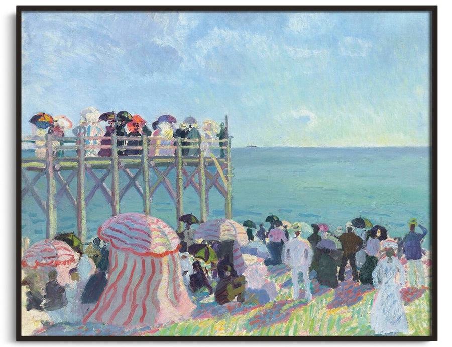 Die Komposition zeigt eine Menge von Spaziergängern, die sich an einem Strand und auf einem hölzernen Steg versammelt haben und dem Meer zugewandt sind. Die Palette wird von Pastelltönen dominiert: Hellblau für den Himmel und das Wasser, Rosa und Hellgrün für die Sonnenschirme, die Kleidung und die gestreiften Sonnenschirme. Das Licht wird mit großer Aufmerksamkeit behandelt und gleichmäßig gestreut. Die Formen bleiben lesbar, aber wenig detailliert, mit einem schnellen, vibrierenden Pinselstrich. Das Ganze schildert einen Moment der Ruhe und des Beobachtens vor dem Meereshorizont.
