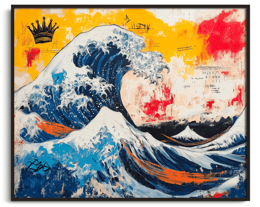 Diese Version der Großen Welle von Kanagawa taucht in die rohe und frenetische Energie von Jean-Michel Basquiat ein. Hokusais ikonische Welle verwandelt sich in einen chaotischen Strudel aus leuchtenden Farben, zersplitterten Strichen und rauen Texturen. Farbspritzer und Basquiats charakteristische Symbole, darunter seine berühmte Krone, dynamisieren die Komposition und verleihen dem Ozean eine protestantische und instinktive Dimension. Zwischen Abstraktion und Expressionismus erfindet dieses Werk die Kraft der Natur in einer grafischen Sprache neu, in der die Emotion über die Form gestellt wird.Comparez avec l’original