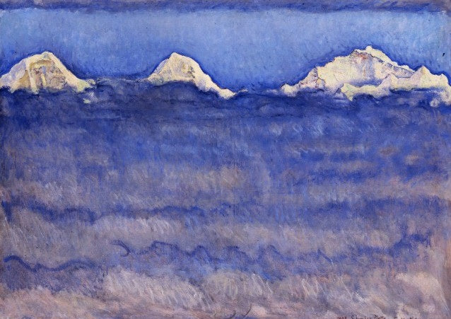 Eiger, Mönch et Jungfrau au-dessus de la mer de brouillard de Ferdinand Hodler est une peinture impressionnante qui capture la puissance de la nature. Sur fond de ciel dramatique, les trois sommets majestueux sont fièrement exposés dans toute leur grandeur, s'élevant de la mer de brouillard en contrebas. Les couleurs vives et les doux coups de pinceau traduisent l'appréciation de l'artiste pour ces montagnes majestueuses, à l'écart de l'agitation de la vie quotidienne. Cette peinture nous donne l'occasion de réfléchir à notre propre insignifiance et nous aide à comprendre à quel point nous sommes vraiment petits face à la puissance de la nature.
