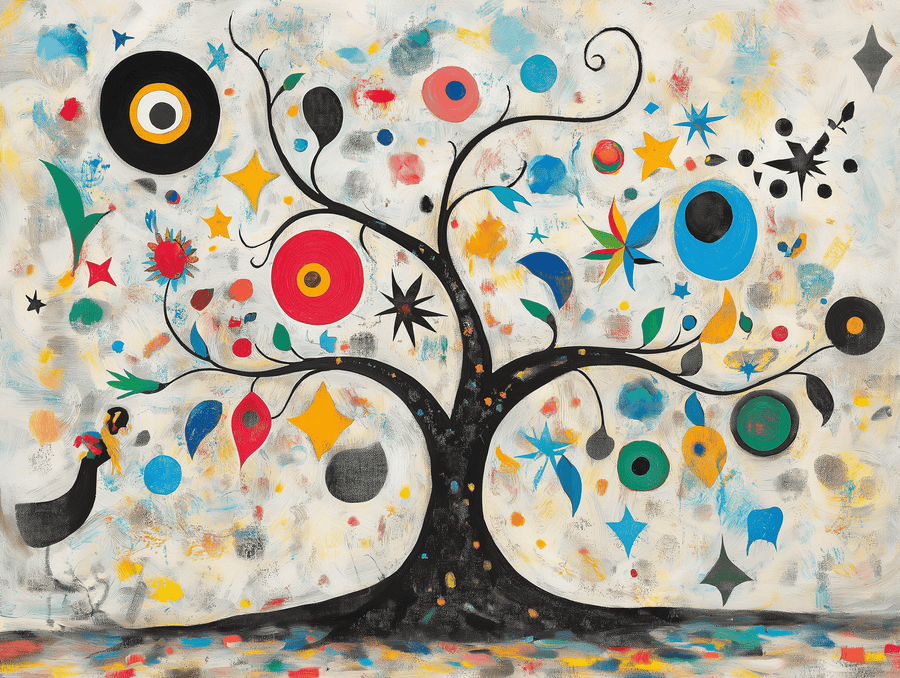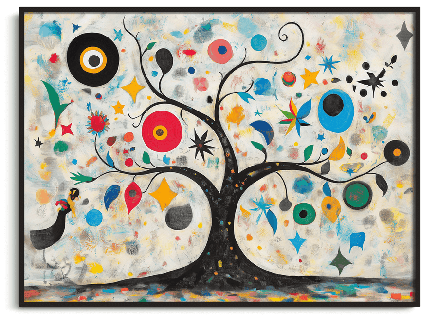 In this dreamlike version, “The Tree of Life” soars like a joyful arabesque through the heart of a fantasised cosmos, reinvented by Miró's mischievous eye. The black trunk twists into supple curves, like a thread of surrealist thought, while the branches become living lines strewn with floating forms - stars, spirals, giant eyes and multicoloured drops. Each leaf seems to be a planet, each fruit a symbol. Gravity no longer holds sway: everything levitates, bursts, plays. The tree is no longer just a link between heaven and earth, but a cosmic theatre where life unfolds in signs, colours and spontaneous rhythms. A celebration of pure imagination, freed from all earthly logic.Comparez avec l’original
