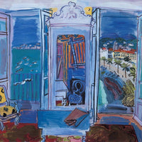 Peint dans les années 1920, ce tableau s’inscrit dans une série d’œuvres où Raoul Dufy explore les intérieurs donnant sur la Méditerranée, particulièrement depuis Nice, où il séjourne régulièrement. Cette période marque un tournant décoratif et lumineux dans son travail, influencé par la lumière du Sud de la France. Il s’inspire ici de l’idée de la fenêtre comme lien entre le confort intime et le paysage extérieur, thème qu’il partage avec d’autres peintres modernes comme Matisse.