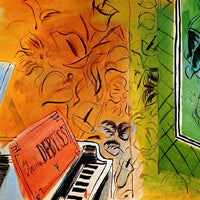 Au XXe siècle, Raoul Dufy développe un intérêt marqué pour la musique et les arts décoratifs, qu’il intègre souvent dans ses compositions picturales. Ce tableau rend hommage au compositeur français Claude Debussy, dont la sensibilité musicale trouve un écho dans la légèreté et les rythmes visuels de la peinture de Dufy. Il ne cherche pas à représenter une scène concrète, mais plutôt à évoquer un univers sonore et intime lié à la création musicale.
