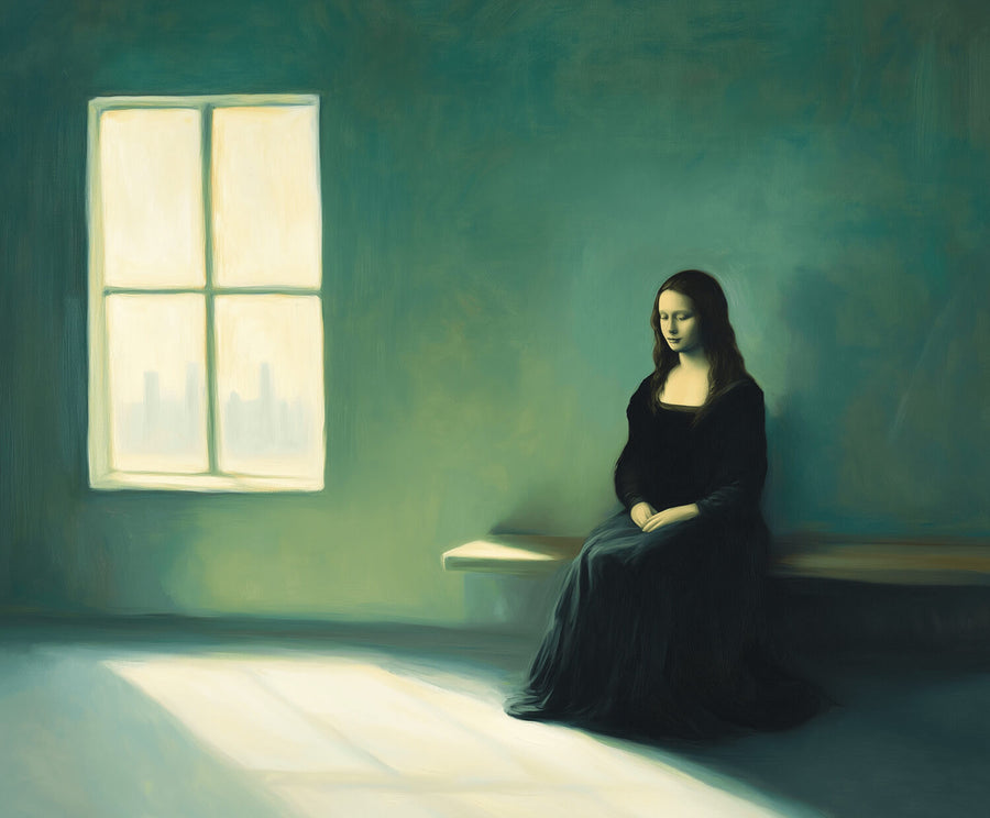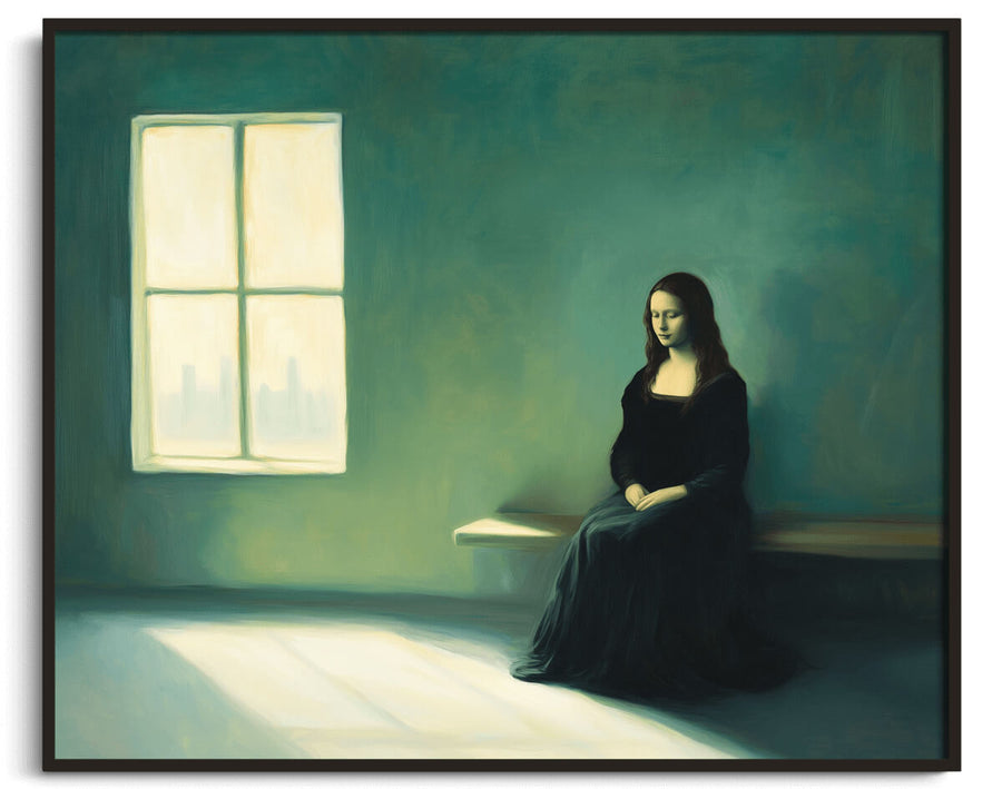 Revisitée dans l’atmosphère mélancolique propre à Edward Hopper, La Joconde se retrouve isolée dans un espace baigné d’une lumière froide et silencieuse. Assise sur un banc, son regard énigmatique semble plus introspectif, presque perdu dans la solitude du cadre. Loin du sourire chaleureux de l’original, cette version évoque un sentiment de vide et de distance, renforcé par la lumière filtrant à travers une fenêtre, laissant entrevoir un monde extérieur inaccessible.