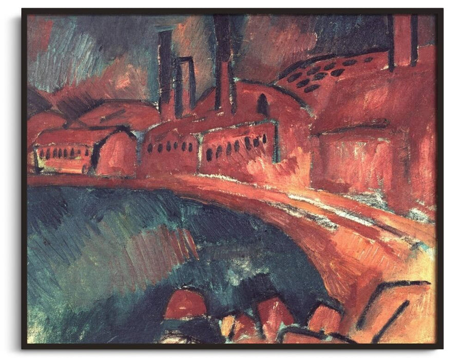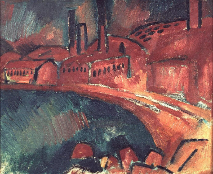 La peinture montre un complexe de bâtiments rouges, allongés le long d’un cours d’eau sombre, dominés par de hautes cheminées. L’ensemble est peint avec des teintes chaudes, principalement des rouges et ocres, contrastant avec les verts et bleus profonds de l’eau. La matière est appliquée par larges touches visibles, les formes sont simplifiées et cernées de traits noirs. Le point de vue légèrement en surplomb et l’absence de figures humaines renforcent la sensation de masse et de silence industriel. Le sujet principal reste ici l’architecture industrielle, saisie dans sa matérialité brute.