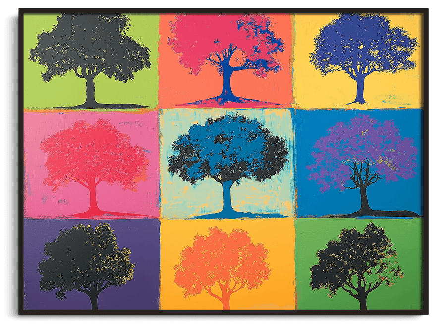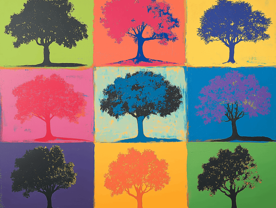 Cette réinterprétation pop de l’Arbre de Vie rend hommage à Andy Warhol et à sa célébration des symboles démultipliés. Chaque carré devient un manifeste visuel, une variation vibrante sur le thème de la vitalité, où les couleurs claquent comme des slogans. L’arbre se répète, change de ton, se transforme sans jamais perdre son essence : un repère universel, revisité à la manière d’un pop art sacré.